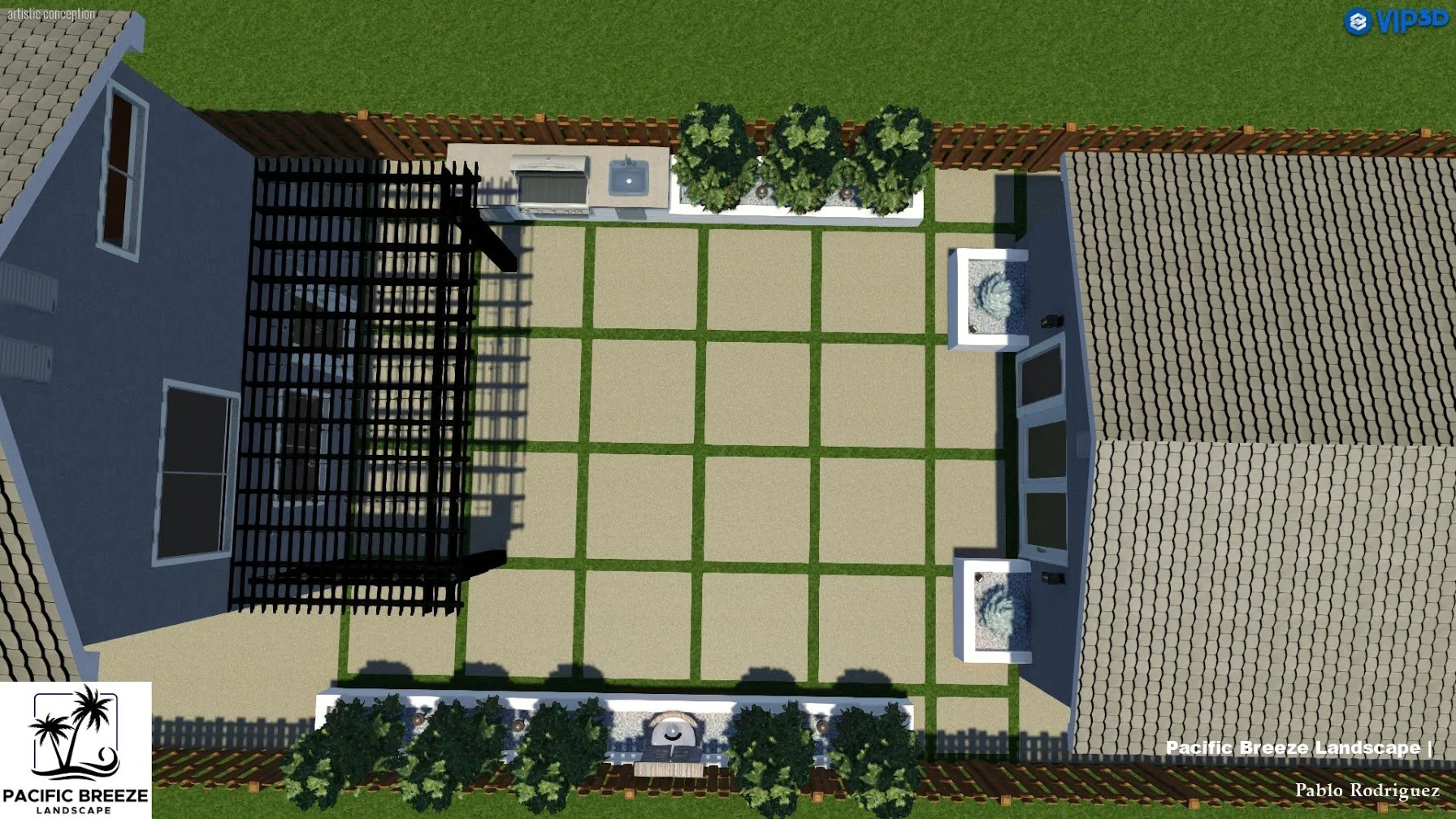 (concrete, paver pads, or simple decking)Fresh planting layout
